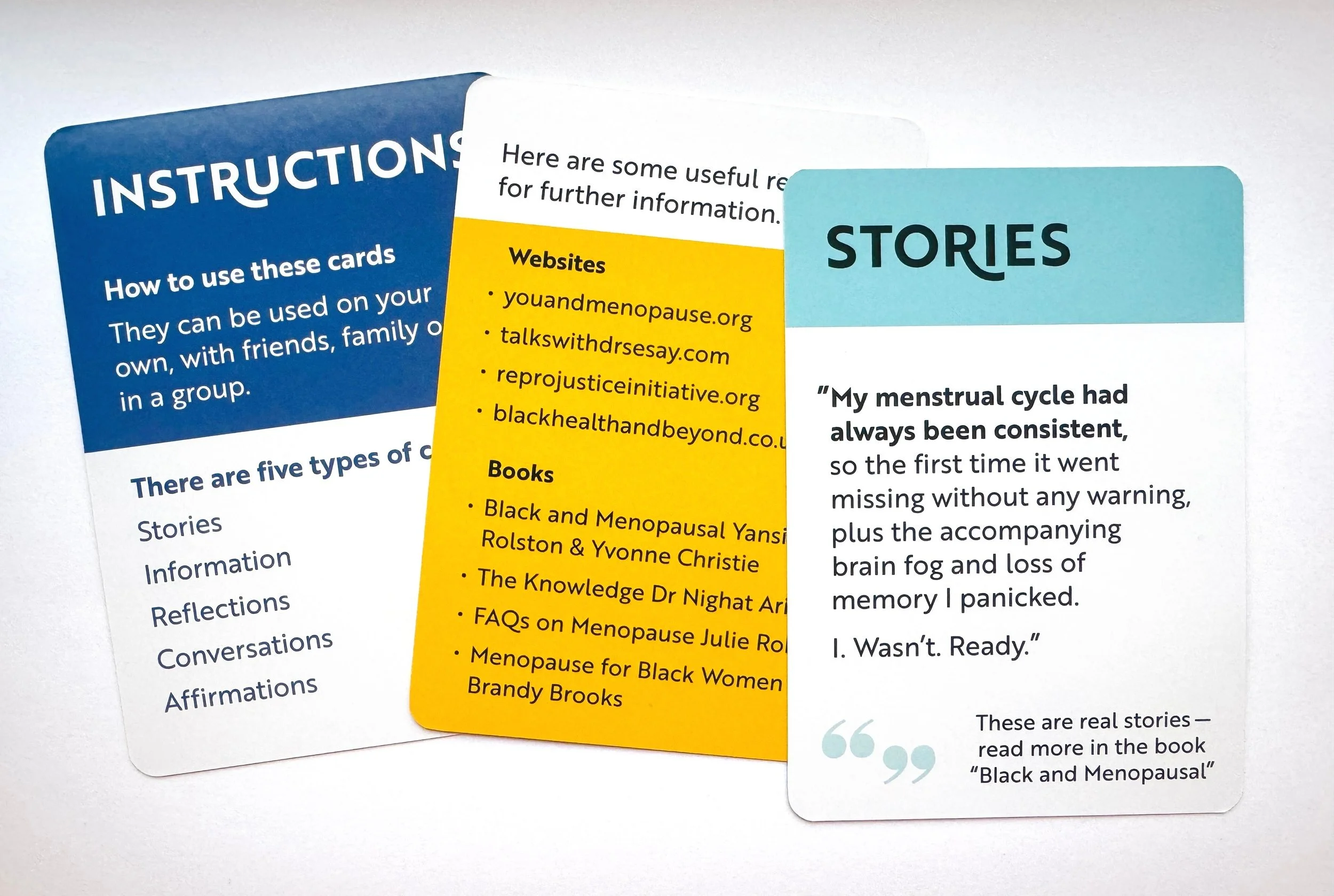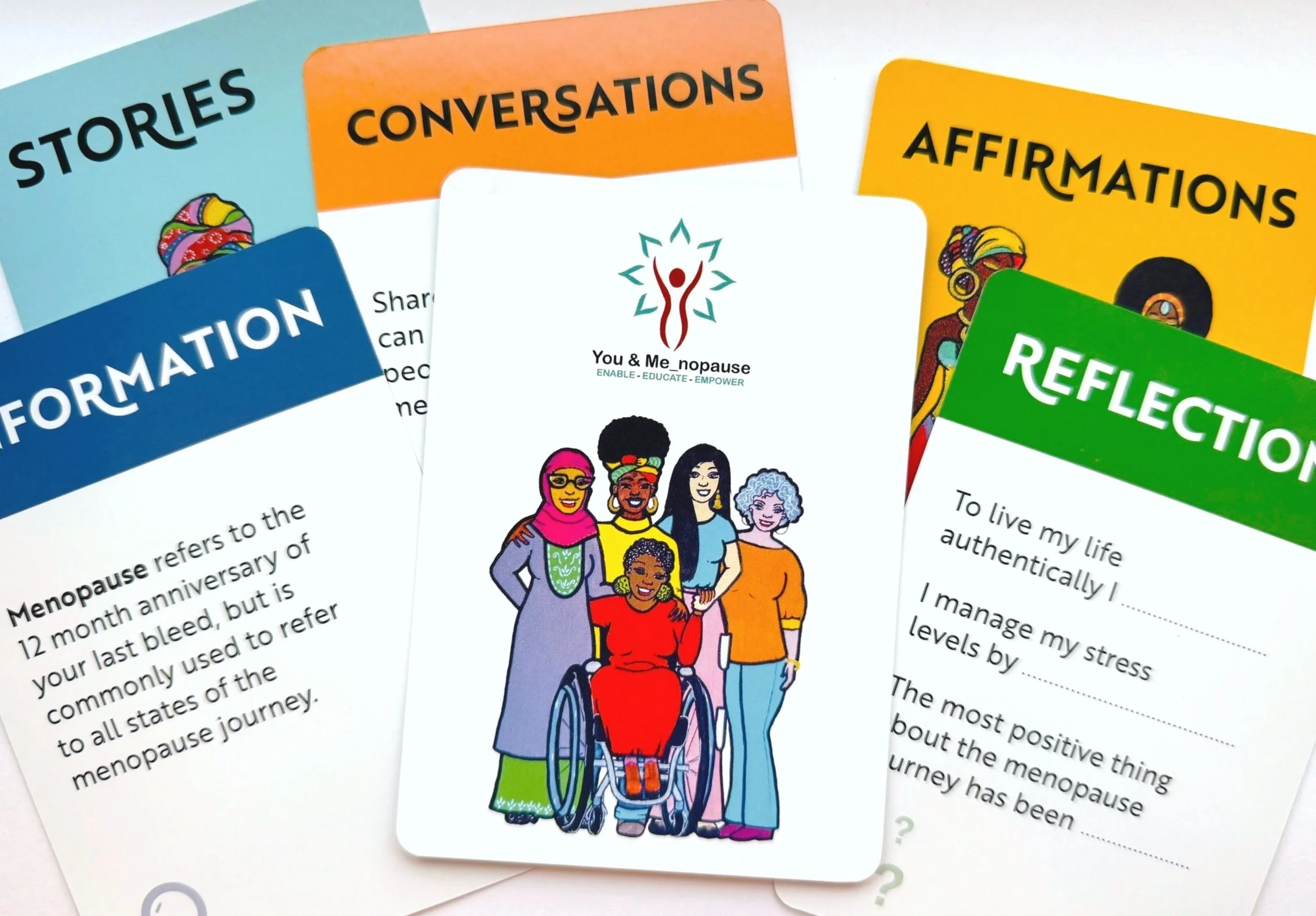 You and Menopause received some funding from Impact on Urban Health to help deepen understanding of menopausal experiences of Black and racially minoritised and LGBTQIA+ communities and create resources. We helped to co-design and create a pack of cards that supports people through the journey of menopause. This project and resources specifically focused on co-designing resources for Black and racially minoritised and LGBTQIA+ communities.